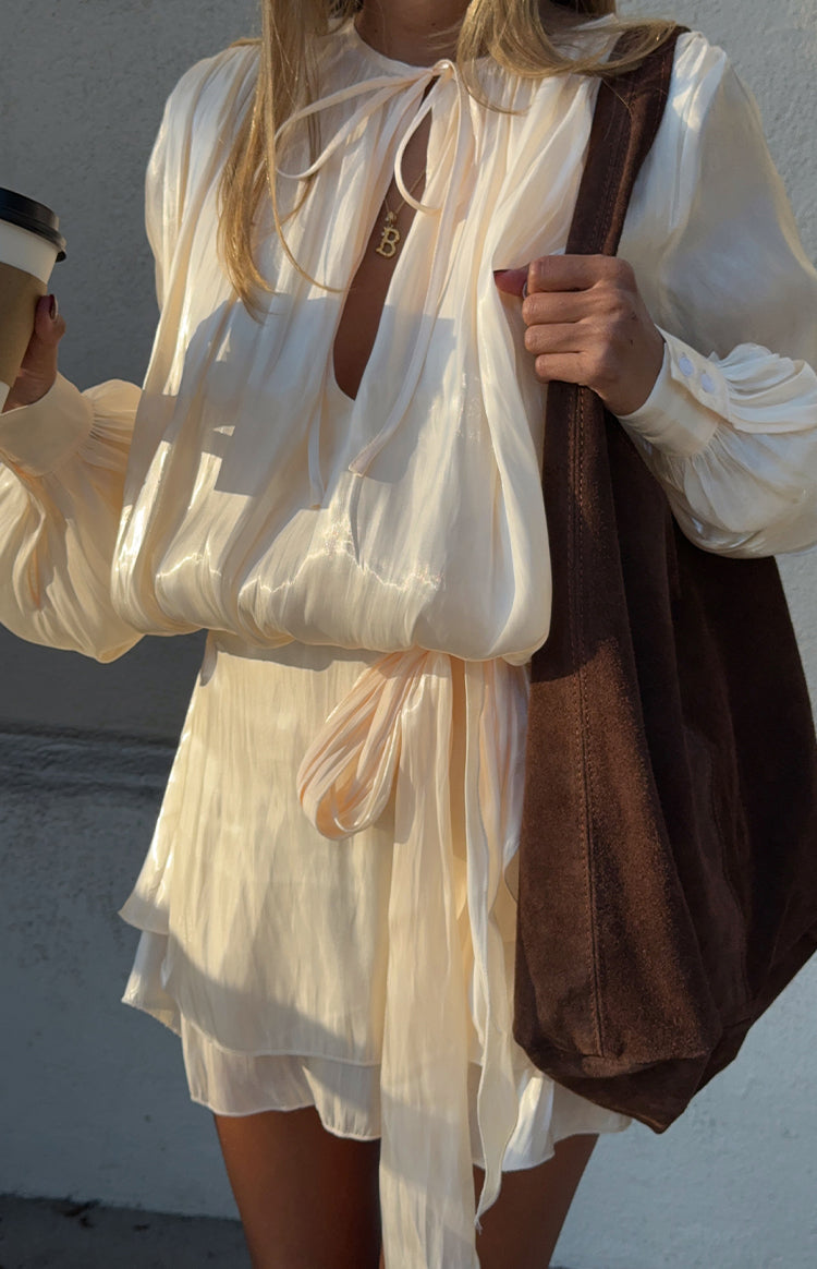 Step into sophistication with our Quinton Pearl Long Sleeve Tie Mini Dress, the perfect choice for date night or an elevated soirée! Crafted from a luxe satin plisse material, it features a charming front keyhole cut-out and a flowy hem for a playful yet refined silhouette. Complete the look with strappy and a delicate clutch for a polished finish.